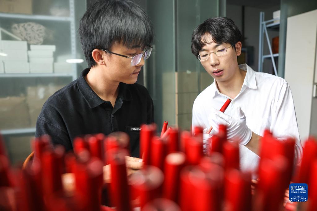 7月1日,袁建(右)與同事在位于貴州大學(xué)國家大學(xué)科技園的工作室討論鋼筆制作細節。