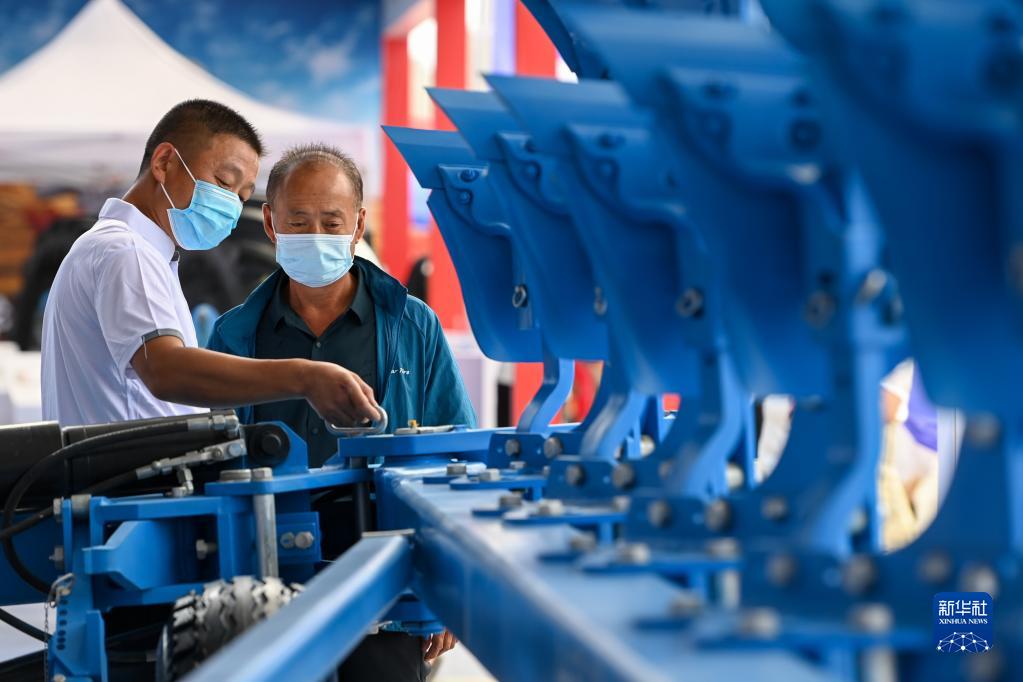 7月3日,在2022新疆農業(yè)機械博覽會(huì )上,工作人員為與會(huì )者介紹翻犁機。