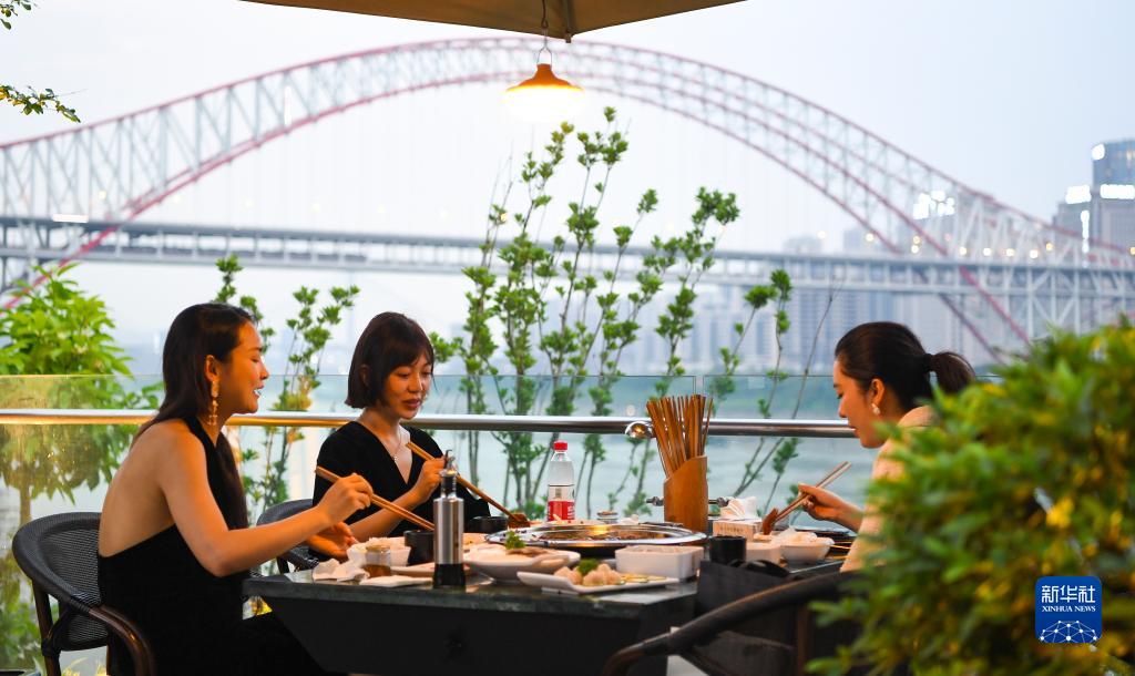 消費者在重慶三洞橋風(fēng)情街吃火鍋(5月31日攝)。
