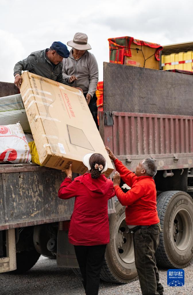 雙湖縣多瑪鄉果根擦曲村的村民將行李搬上貨車(chē)(7月12日攝)。