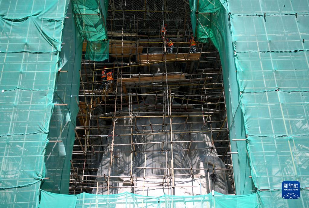 工作人員在洛陽(yáng)龍門(mén)石窟奉先寺拆除腳手架(7月21日攝)。 新華社發(fā)(張怡熙 攝)