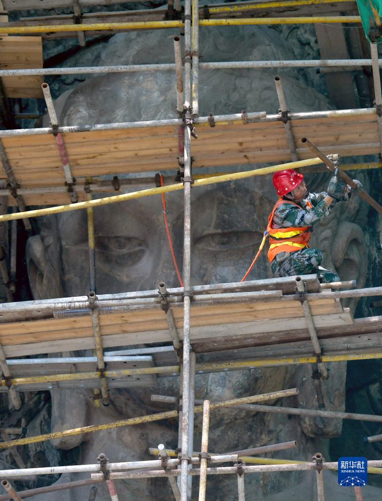工作人員在洛陽(yáng)龍門(mén)石窟奉先寺拆除腳手架(7月21日攝)。 新華社發(fā)(張怡熙 攝)