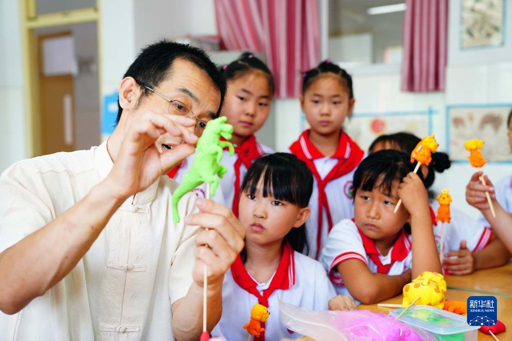 7月28日,在山東省齊河縣祝阿鎮馬坊社區鄉村“復興少年宮”,王向東在教小朋友捏面塑。