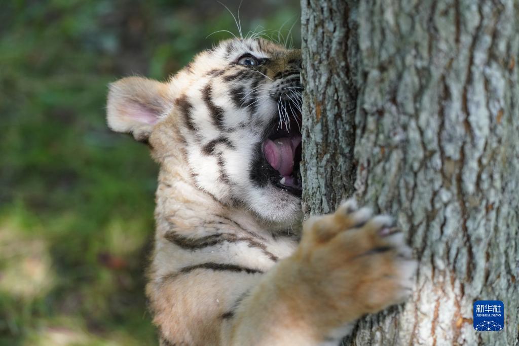 7月29日,東北虎幼虎在中國橫道河子貓科動(dòng)物飼養繁育中心活動(dòng)區玩耍。