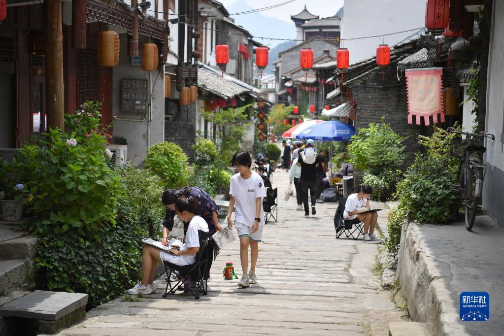7月31日,學(xué)生在留壩縣城老街上寫(xiě)生。