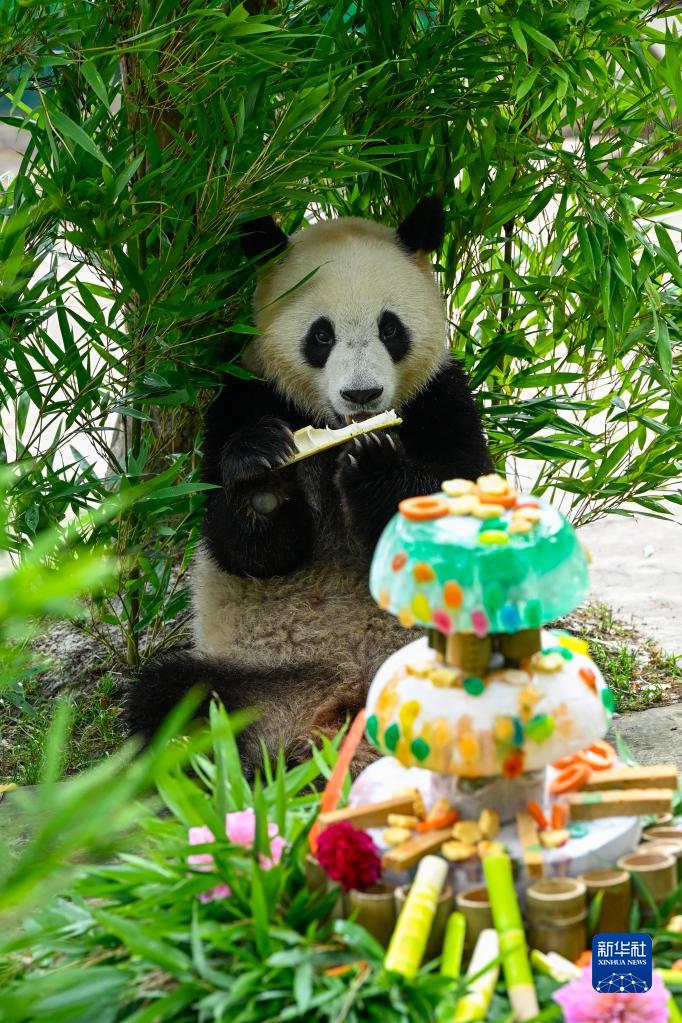 8月3日,在中國大熊貓保護研究中心雅安基地,大熊貓“雅雅”享用美食。