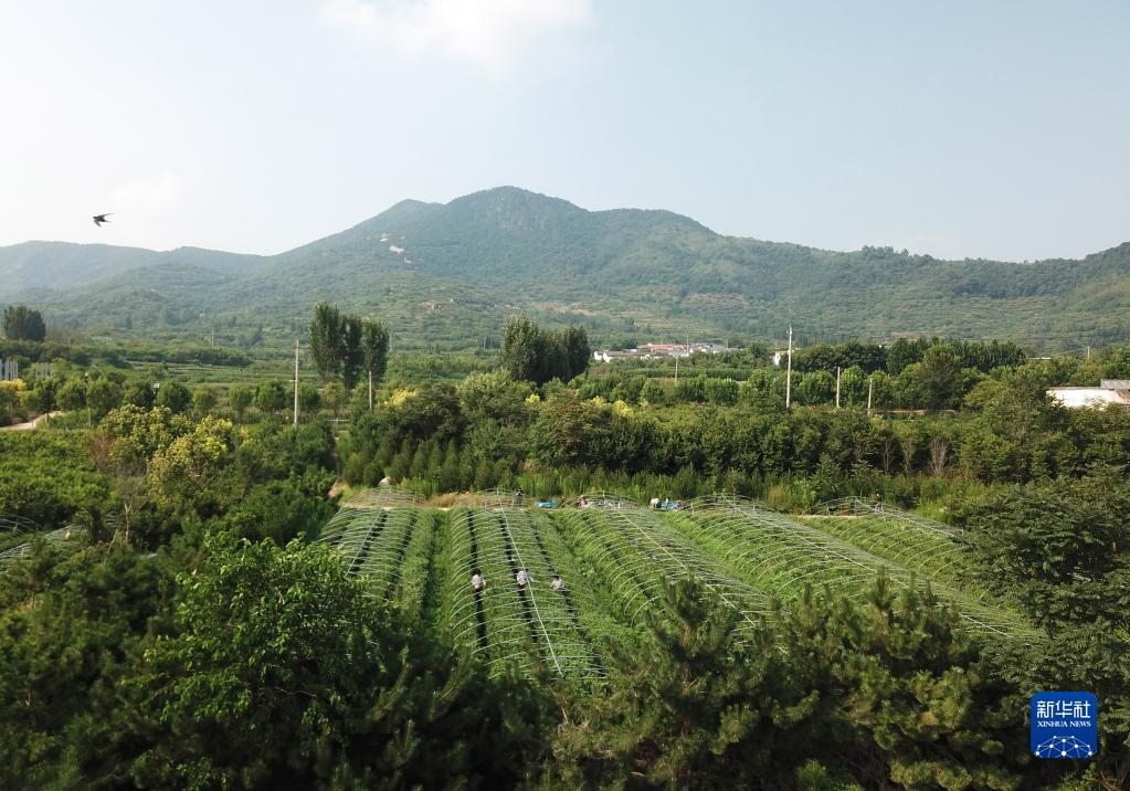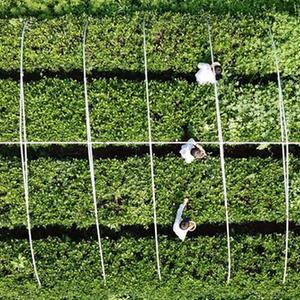 8月3日,在山東省泰安市岱岳區道朗鎮,茶農采摘夏茶(無(wú)人機照片)。