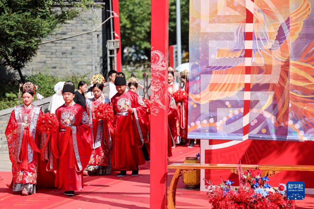 當日是七夕,2022(壬寅)年貴陽(yáng)孔學(xué)堂中華婚禮在貴陽(yáng)孔學(xué)堂舉辦,12對新人身穿中式婚服通過(guò)合巹禮、解纓結發(fā)、共書(shū)婚帖等方式完成傳統婚禮儀式。
