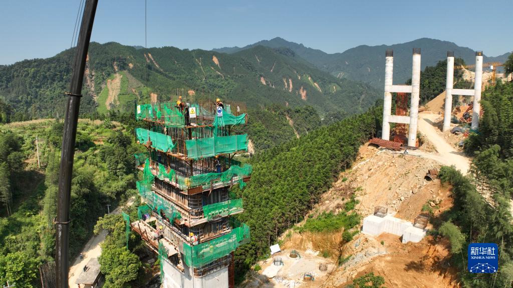 8月3日上午,融安至從江高速公路一期工程融水段,工人在橋墩上施工。