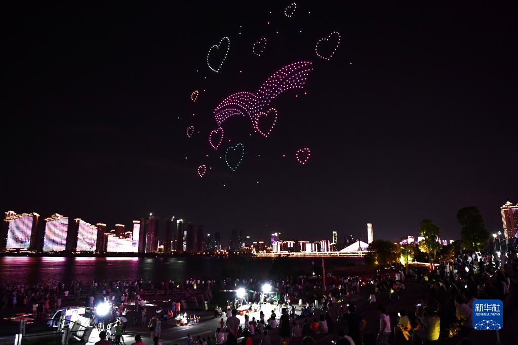 當日是七夕節,一場(chǎng)無(wú)人機光影秀在湖南省長(cháng)沙市湘江畔上演,吸引市民駐足觀(guān)看。