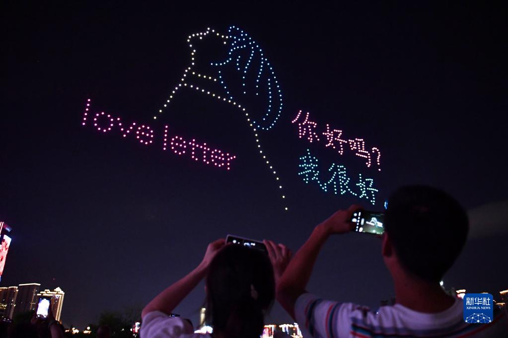 當日是七夕節,一場(chǎng)無(wú)人機光影秀在湖南省長(cháng)沙市湘江畔上演,吸引市民駐足觀(guān)看。