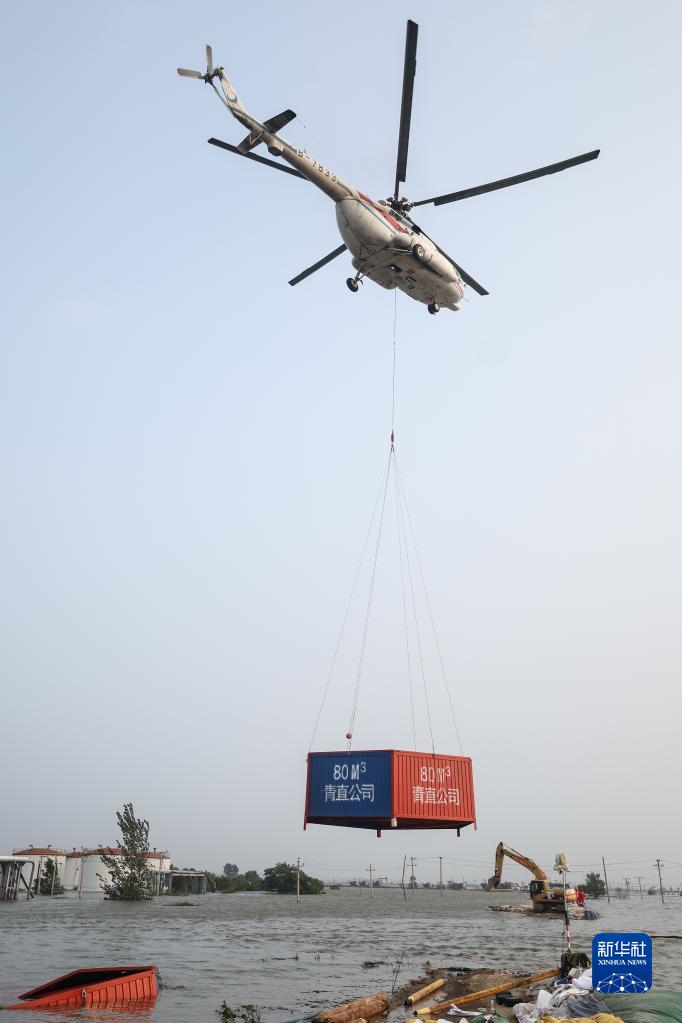 8月4日,直升機在潰口處投放六角沉箱。