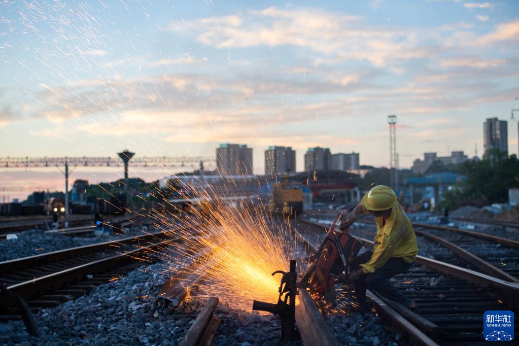 8月5日,在株洲北站編組場(chǎng),鐵路工人正在鋸軌。
