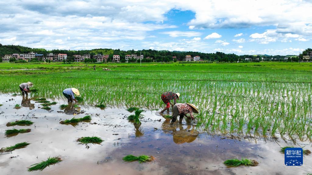 8月5日,在湖南省常寧市勝橋鎮泉峰冠村,農民在搶插晚稻(無(wú)人機照片)。