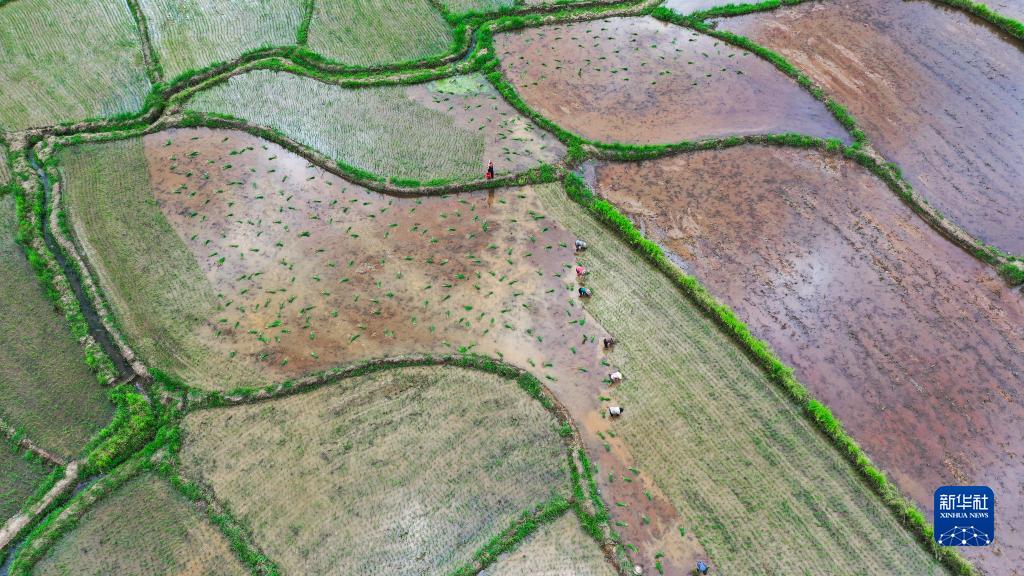 8月5日,在湖南省常寧市勝橋鎮泉峰冠村,農民在搶插晚稻(無(wú)人機照片)。