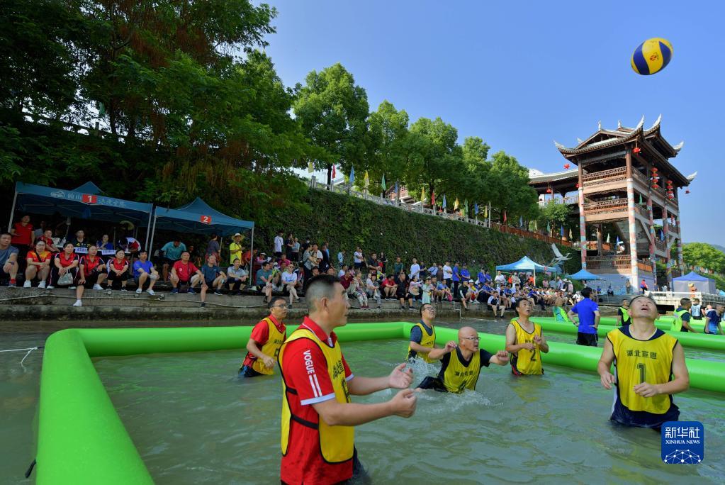 近日,湖北省宣恩縣在當地仙山貢水旅游區的貢水河上舉行水上運動(dòng)會(huì )。別具一格的“水上排球”項目吸引了眾多市民和游客參加比賽,享受水上趣味運動(dòng)帶來(lái)的歡樂(lè )。