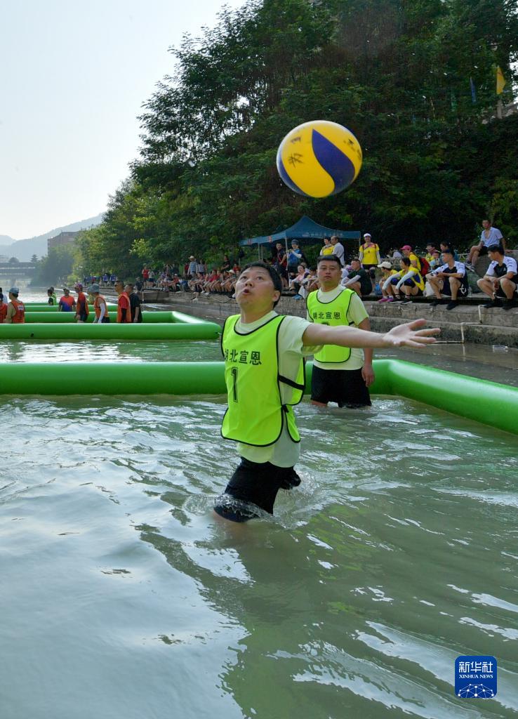 近日,湖北省宣恩縣在當地仙山貢水旅游區的貢水河上舉行水上運動(dòng)會(huì )。別具一格的“水上排球”項目吸引了眾多市民和游客參加比賽,享受水上趣味運動(dòng)帶來(lái)的歡樂(lè )。