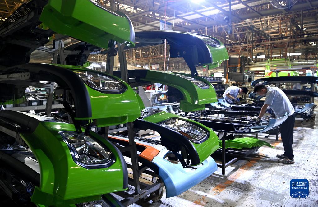 在陜西汽車(chē)控股集團有限公司總裝車(chē)間,工作人員在裝配車(chē)輛(2022年7月12日攝)。