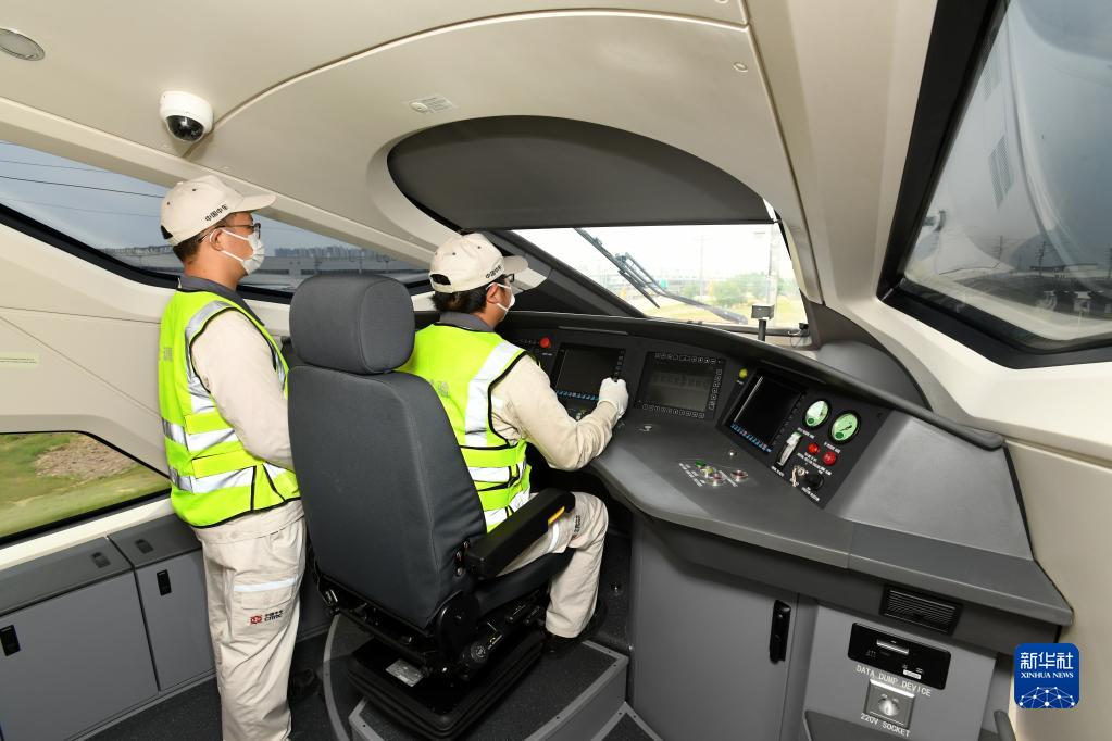 8月5日,工程人員駕駛雅萬(wàn)高鐵高速動(dòng)車(chē)組行駛在位于山東省青島市的中車(chē)四方股份公司環(huán)形試驗線(xiàn)上。