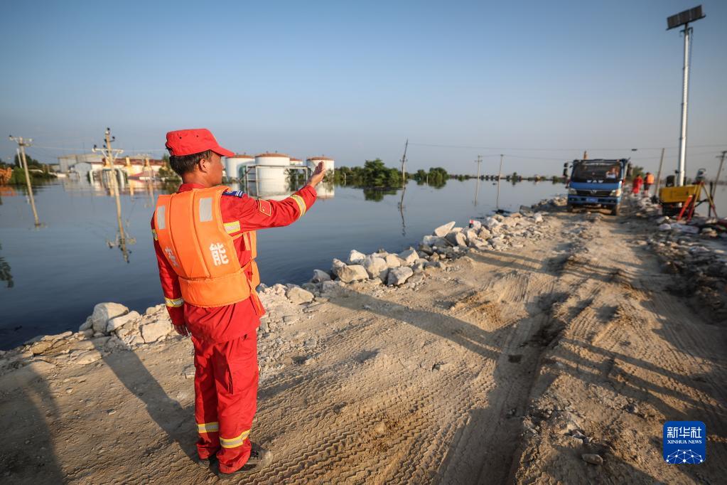 8月5日,中國安能集團搶險人員指揮運送搶險物料的車(chē)輛前往潰口進(jìn)行封堵作業(yè)。