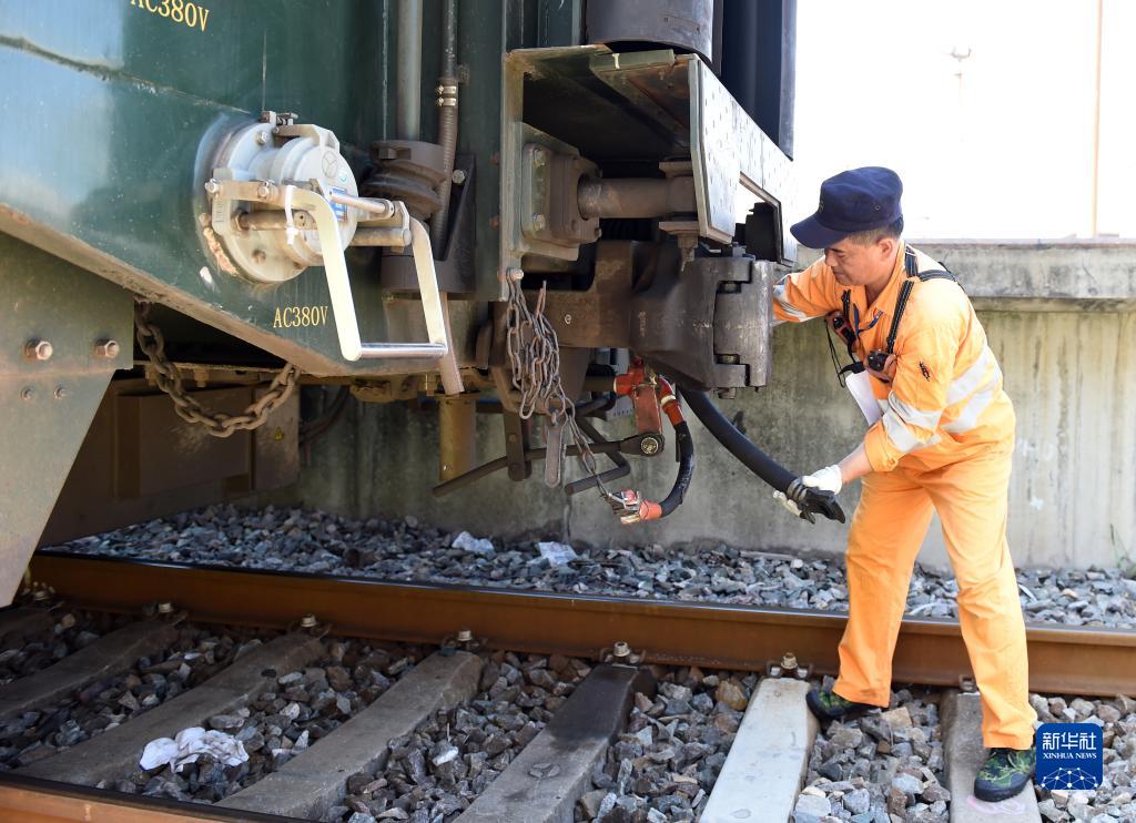 8月5日,合肥火車(chē)站運轉車(chē)間調車(chē)長(cháng)李健在調試車(chē)輛制動(dòng)軟管,準備對列車(chē)進(jìn)行編組。