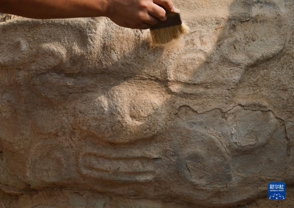 8月6日,考古人員清理在陜西神木石峁遺址皇城臺新近出土的石雕。