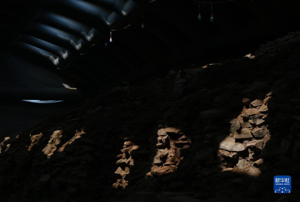 這是在氣膜保護下的陜西神木石峁遺址皇城臺局部區域(8月6日攝)。