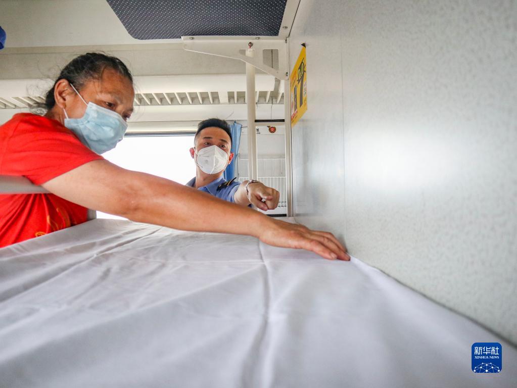 8月5日,在重慶西客車(chē)整備所,守車(chē)車(chē)長(cháng)丁璐(右)督促庫內保潔員對全列臥具進(jìn)行更換。