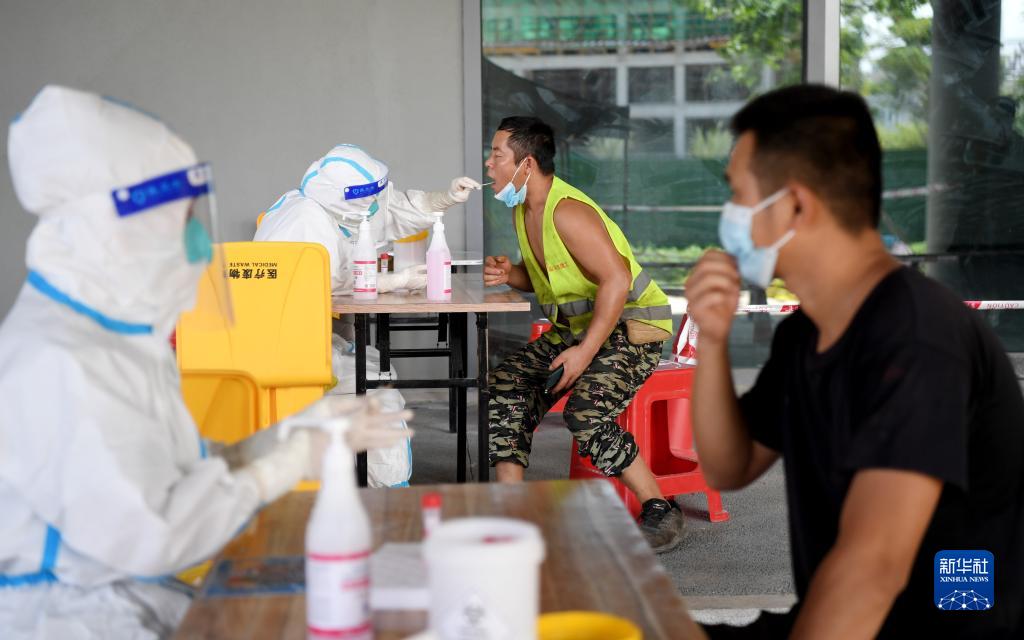 8月7日在三亞國際體育產(chǎn)業(yè)園拍攝的核酸采樣點(diǎn)工作場(chǎng)景。