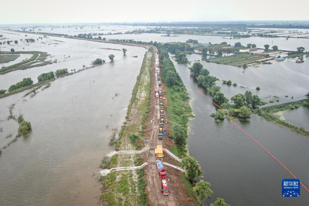 8月7日,搶險人員在遼寧盤(pán)錦繞陽(yáng)河左岸曾經(jīng)的河堤潰口北段進(jìn)行排澇作業(yè)(無(wú)人機照片)。