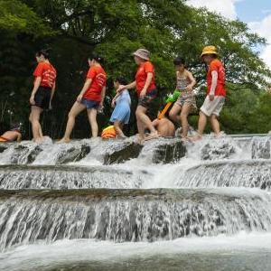 8月8日,湖南省懷化市通道侗族自治縣萬(wàn)佛山鎮木腳村,人們在壩間戲水。
