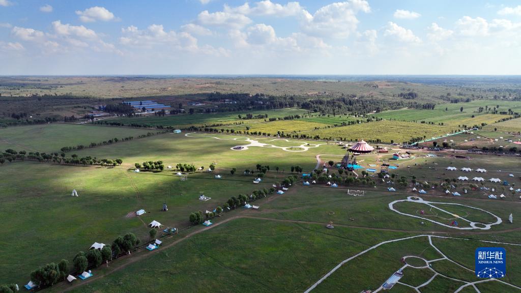 藍天白云下的神木市爾林兔萬(wàn)畝草原風(fēng)光(8月5日攝,無(wú)人機照片)。爾林兔鎮對荒蕪的沙地進(jìn)行保護性開(kāi)發(fā),建成萬(wàn)畝大草原,成了美麗的旅游休閑之地。