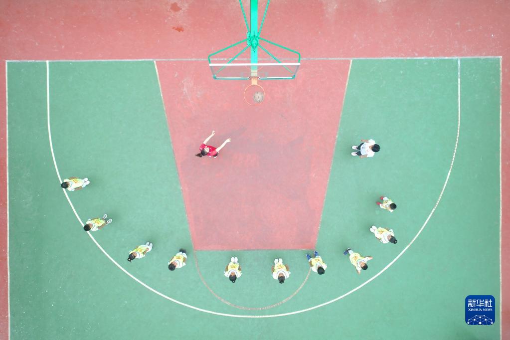8月8日,在河北省唐山市豐潤區,教練在指導小朋友練習籃球基本動(dòng)作(無(wú)人機照片)。