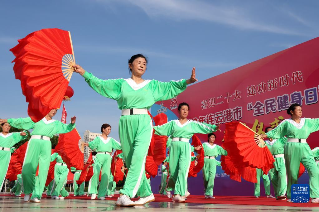 8月8日,在江蘇省連云港市蒼梧綠園,市民參加全民健身日群眾展演活動(dòng)。