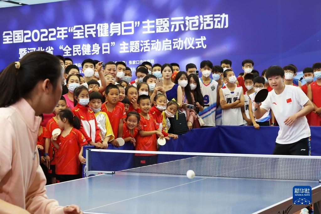 8月8日,乒乓球奧運冠軍孫穎莎(右)在位于河北張家口的國家跳臺滑雪中心陪小朋友打球。