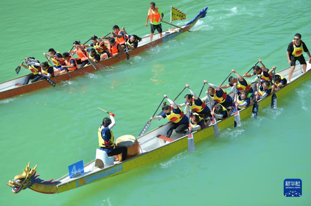 8月8日,市民在湖北省宣恩縣仙山貢水旅游區的貢水河上參加劃龍舟比賽。