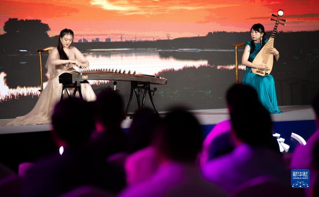 8月8日,演員在2022北京(國際)運河文化節開(kāi)幕式表演琵琶古箏合奏《大運之河》。