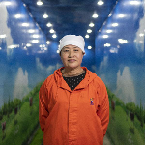 8月4日,崔玉梅在車(chē)間背景墻前的肖像照,后面是藍天白云和養牛的牧場(chǎng)。
