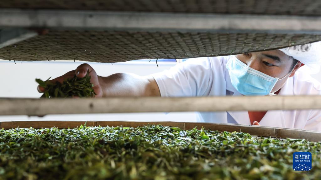 8月9日,工作人員在石阡縣楓香鄉梨子園村茶葉加工廠(chǎng)內對茶青進(jìn)行攤晾。
