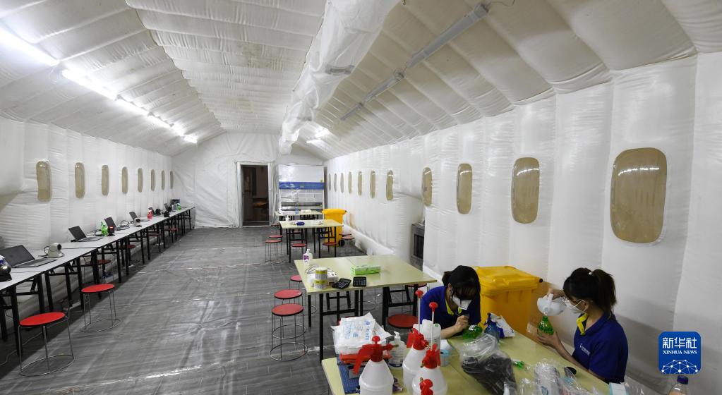 8月9日,江蘇省核酸檢測隊工作人員在實(shí)驗室投入使用前做準備工作。