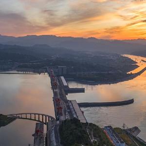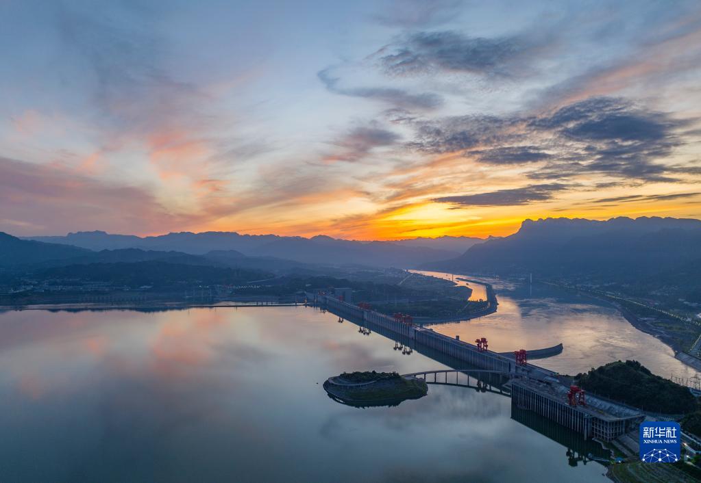 日出時(shí)分,在湖北省宜昌市秭歸縣,朝霞把長(cháng)江三峽大壩裝扮得美不勝收(8月9日,無(wú)人機照片)。