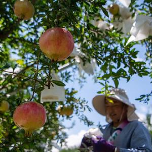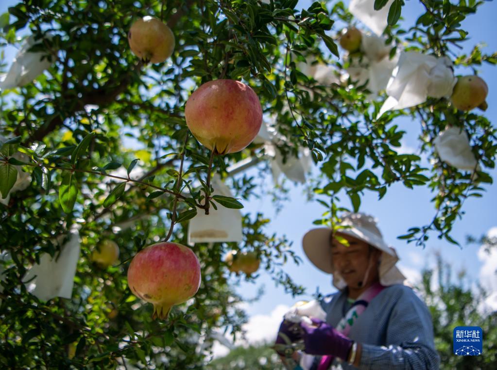果農在云南蒙自市草壩鎮的五八農業(yè)軟籽石榴種植基地采摘石榴(8月9日攝)。