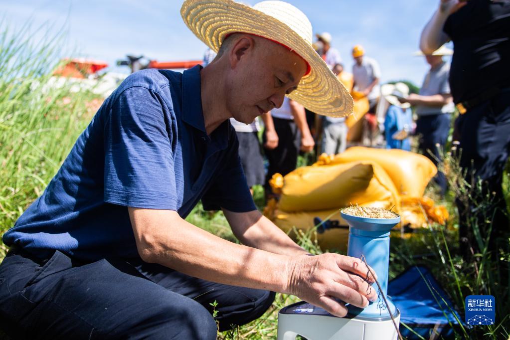 8月10日,在 “一季雜交稻+再生稻”生產(chǎn)模式寧鄉示范基地頭季稻測產(chǎn)驗收現場(chǎng),工作人員檢測稻谷含水量。