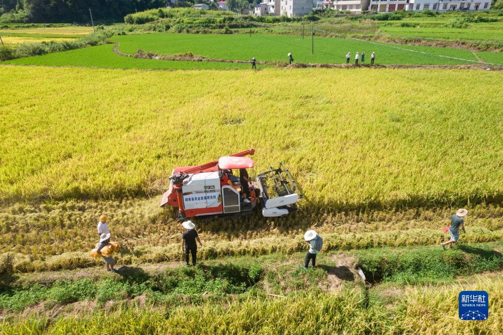 這是8月10日在湖南省長(cháng)沙市寧鄉市流沙河鎮拍攝的“一季雜交稻+再生稻”生產(chǎn)模式寧鄉示范基地頭季稻測產(chǎn)驗收現場(chǎng)(無(wú)人機照片)。