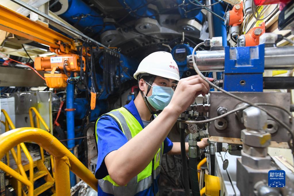 8月10日,施工人員在深江鐵路珠江口隧道檢查“深江1號”盾構機運行狀況。