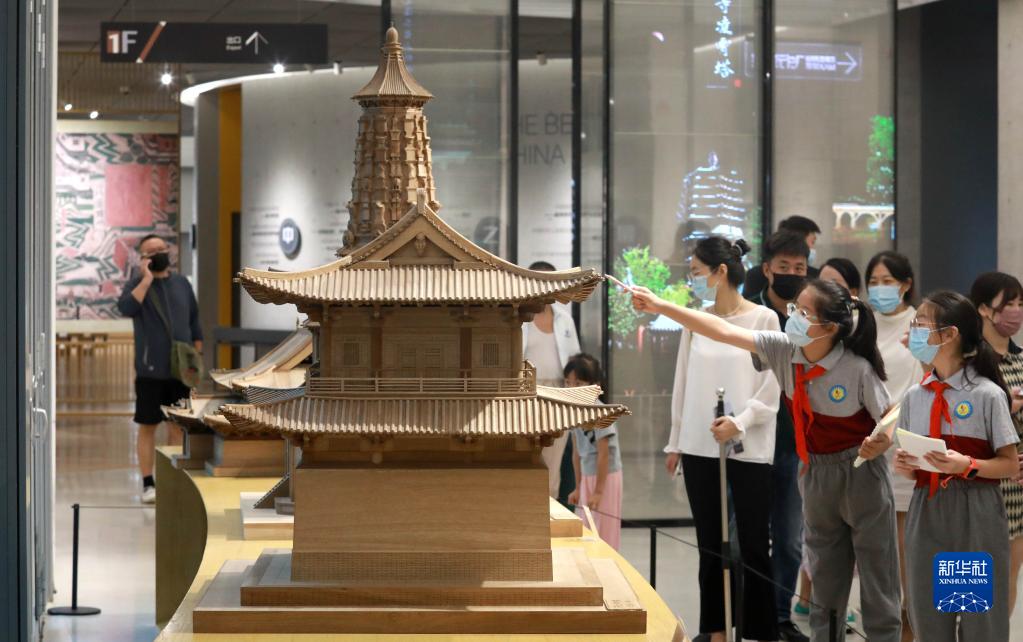 8月10日,在河北省石家莊城市館,學(xué)生們在觀(guān)看正定古建筑模型。