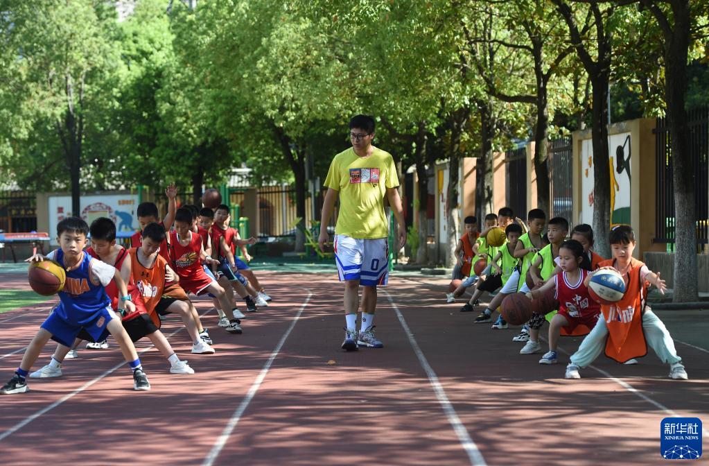 8月11日,在合肥市蜀新苑小學(xué)暑期托管班里,學(xué)生在老師指導下學(xué)習籃球。
