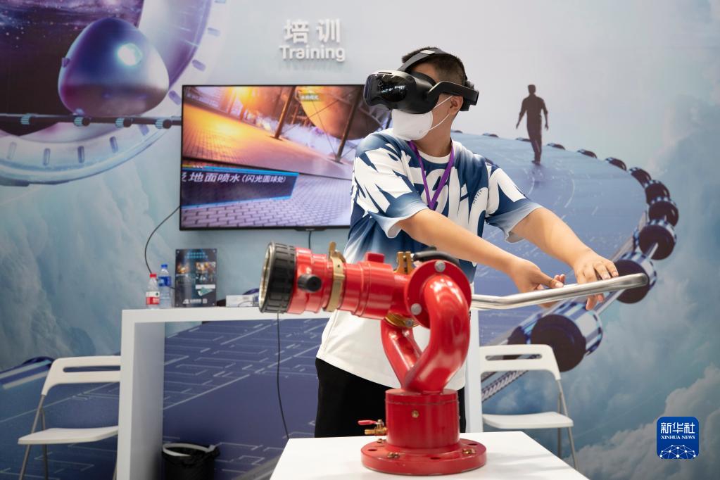8月11日,在2022世界5G大會(huì )展廳里展示的5G網(wǎng)絡(luò )支持下的5G+VR滅火培訓平臺。