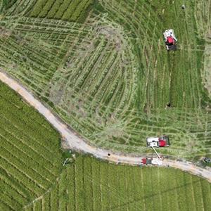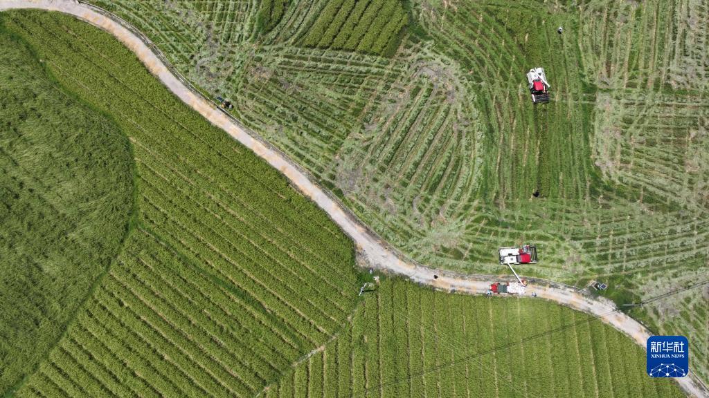 8月11日,農技人員在貴州省黔東南苗族侗族自治州岑鞏縣注溪鎮周坪村雜交水稻制種基地采收種稻(無(wú)人機照片)。
