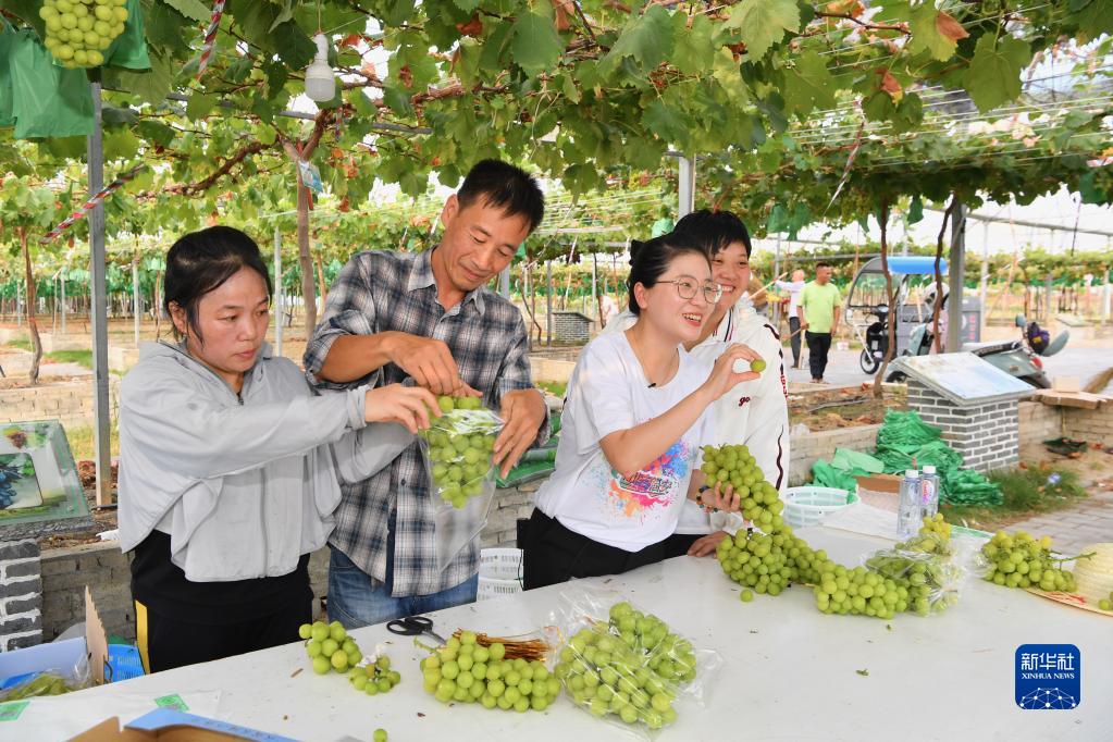 在福建省福安市賽岐鎮象環(huán)村葡萄種植園,果農陳招旺夫婦在返鄉創(chuàng )業(yè)大學(xué)生林恩輝(右二)、陳莉瑾(右一)的直播現場(chǎng)打包新采摘的葡萄(8月9日攝)。